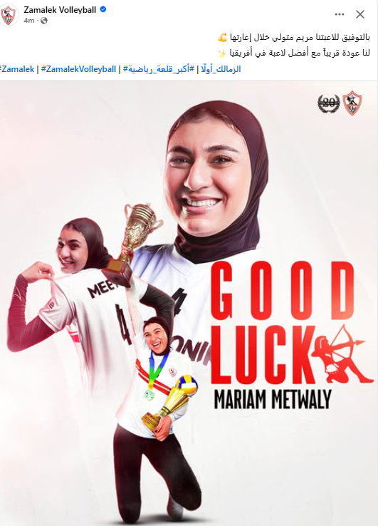 ونشر الحساب الرسمي للنادي رسالة دعم للاعبته، جاء فيها: بالتوفيق للاعبتنا مريم متولي خلال إعارتها.. لنا عودة قريبًا مع أفضل لاعبة في إفريقيا.
