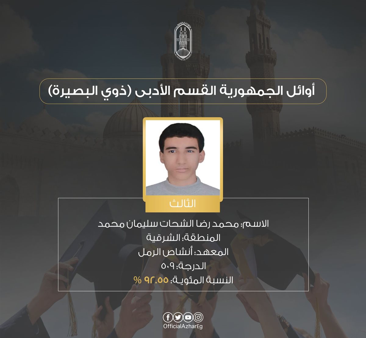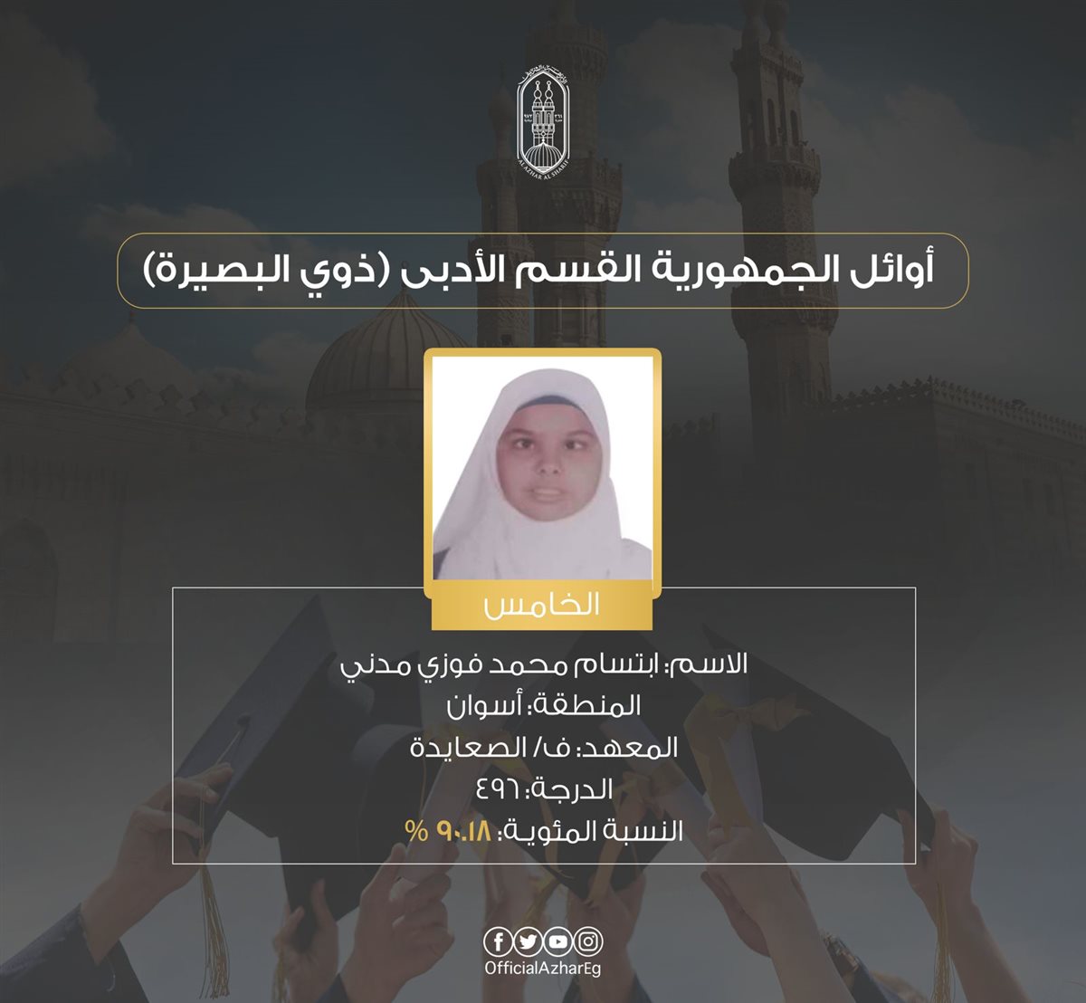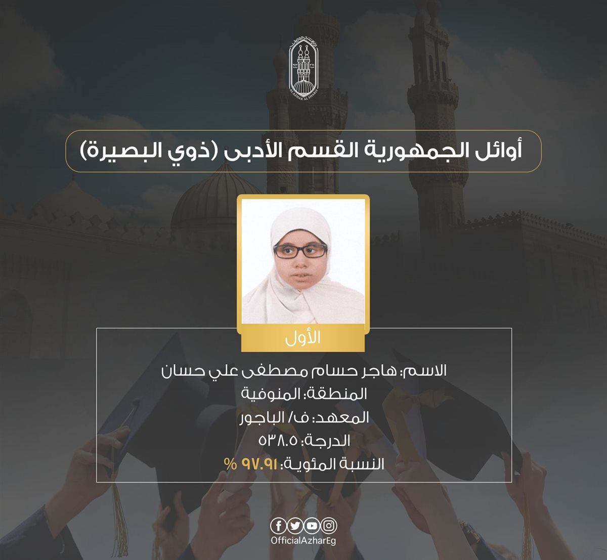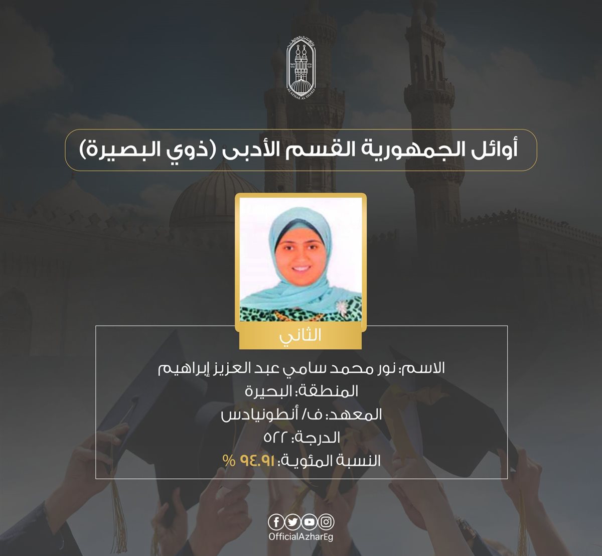 وجاء أوائل القسم الأدبي (ذوو البصيرة) بالشهادة الثانوية الأزهرية على النحو التالي: