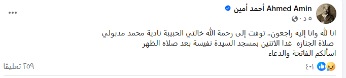 وكتب أحمد أمين منشورا، عبر حسابه الشخصي بموقع التواصل الاجتماعي فيس بوك، قال فيه: انا لله وانا إليه راجعون.. توفت إلى رحمة الله خالتي الحبيبة نادية محمد مدبولي، صلاة الجنازة غدا الاثنين بمسجد السيدة نفيسة بعد صلاه الظهر.. اسألكم الفاتحة والدعاء.