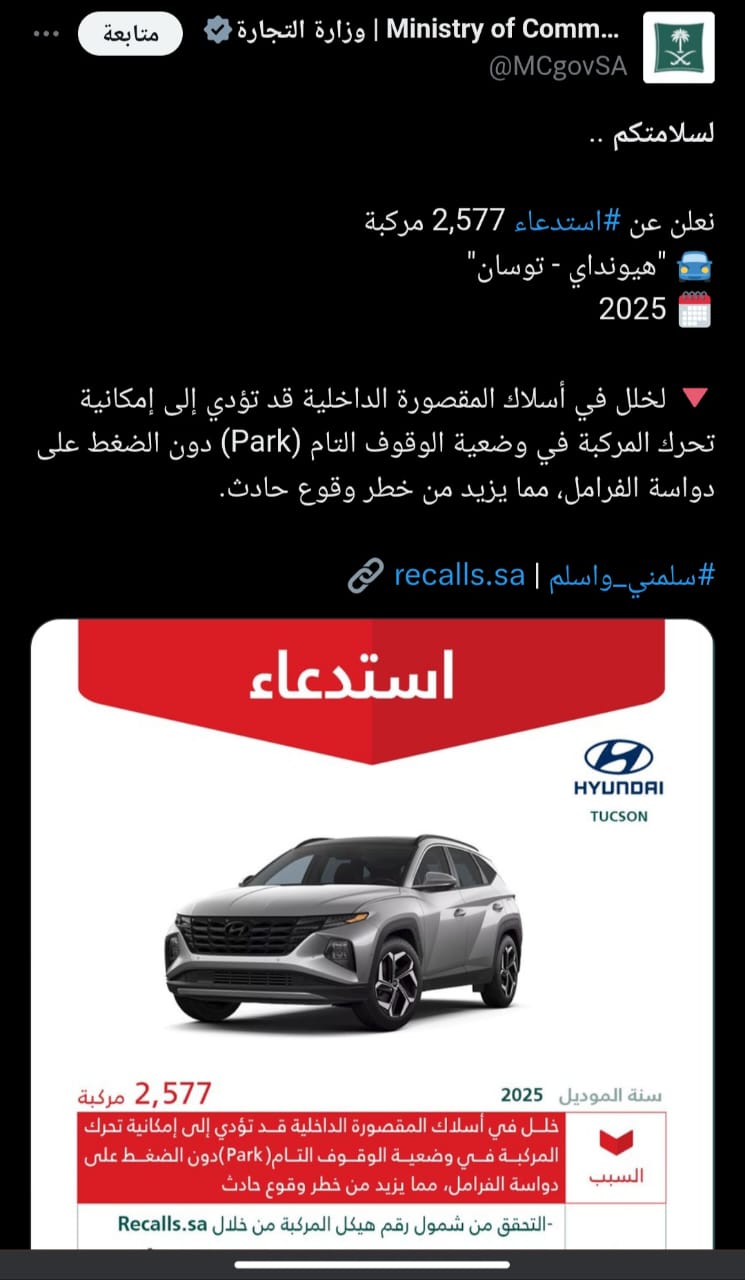 وأوضحت الوزراة عبر حسابها، أن الطراز المعيب هو هيونداي توسان 2025.