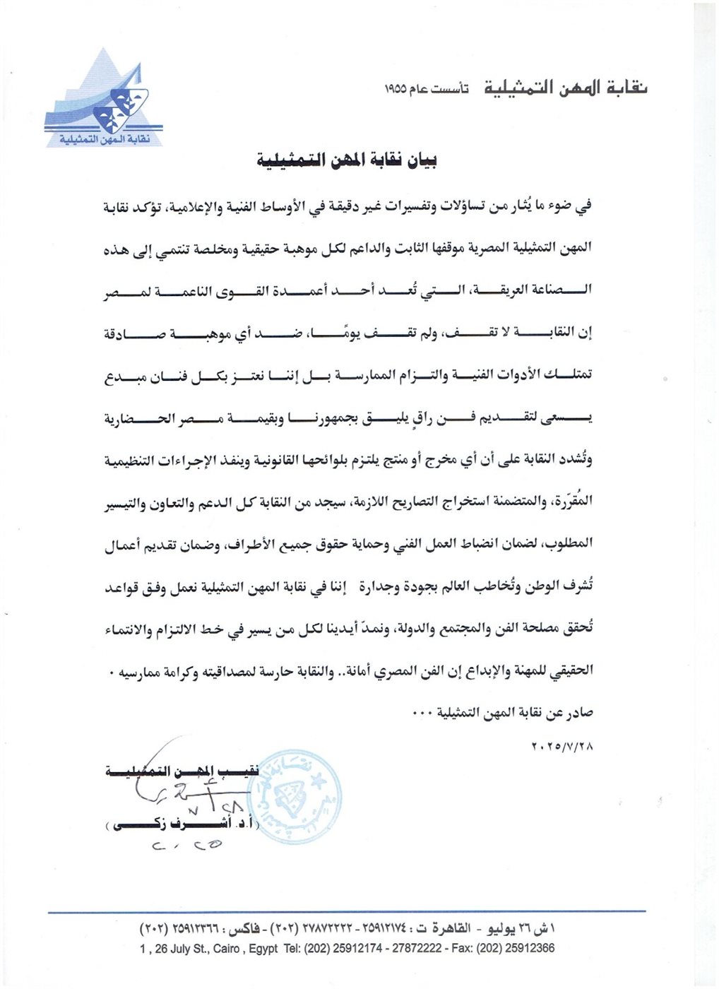 وجاء نص البيان كالتالي: في ضوء ما يثار من تساؤلات وتفسيرات غير دقيقة في الأوساط الفنية والإعلامية، تؤكد نقابة المهن التمثيلية المصرية موقفها الثابت والداعم لكل موهبة حقيقية ومخلصة تنتمي إلى هذه الصناعة العريقة، التي تعد أحد أعمدة القوى الناعمة لمصر، إن النقابة لا تقف، ولم تقف يوما، ضد أي موهبة صادقة تمتلك الأدوات الفنية والتزام الممارسة بل إننا نعتز بكل فنان مبدع يعى لتقديم فن راق يليق بجمهورنا وبقيمة مصر الحضارية.