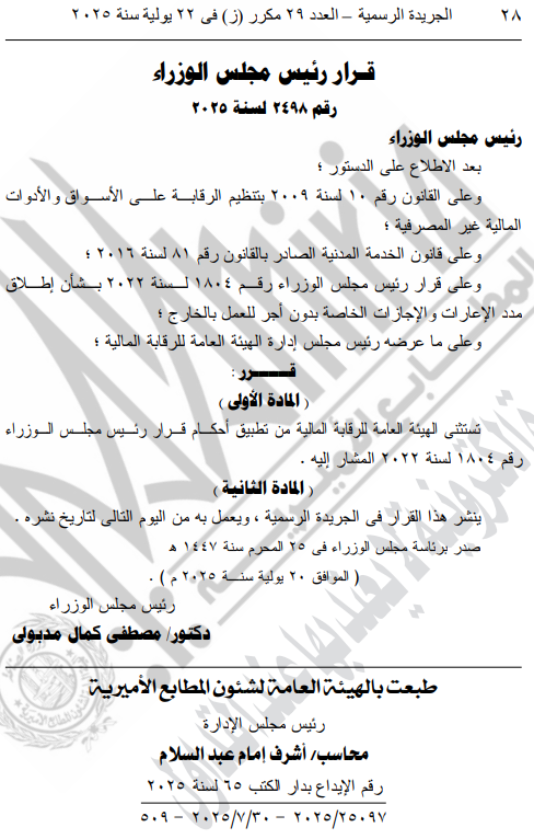 قرار من رئيس الوزراء بشأن الإعارات والإجازات الخاصة بهيئة الرقابة المالية
