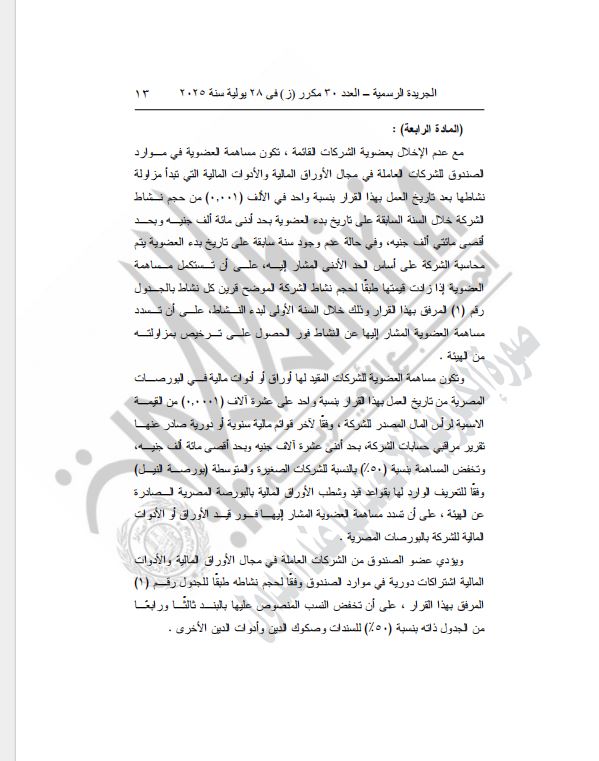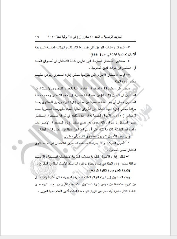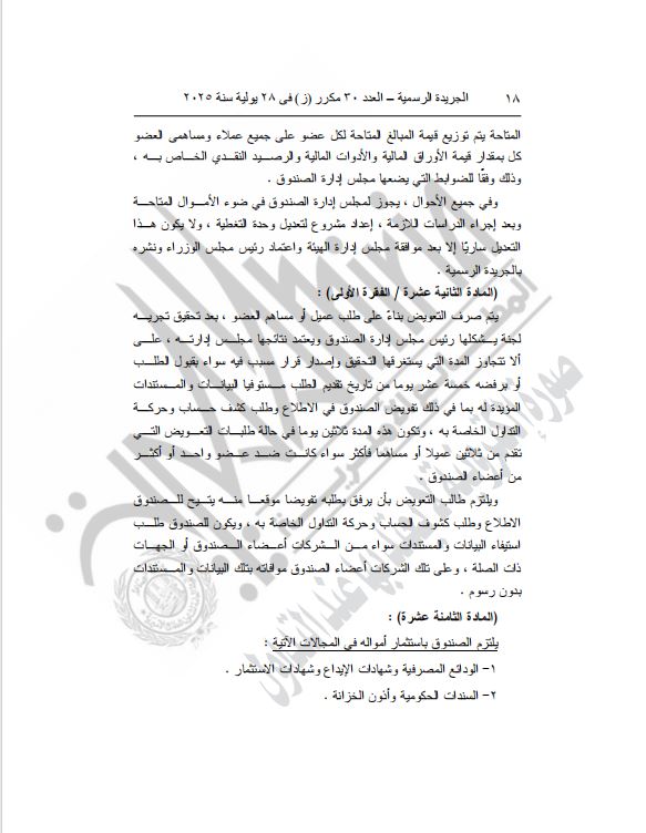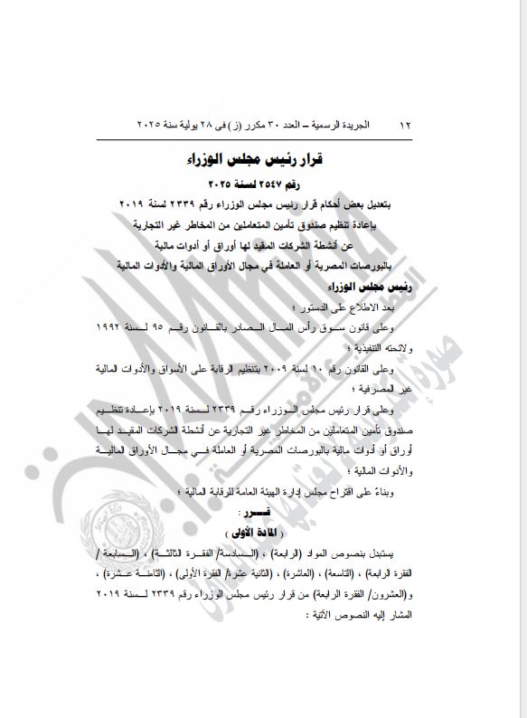 نشرت الجريدة الرسمية قرار رئيس مجلس الوزراء رقم 2547 لسنة 2025، بشأن إعادة تنظيم صندوق تأمين المتعاملين من المخاطر غير التجارية عن أنشطة الشركات المقيد لها أوراق أو أدوات مالية بالبورصات المصرية، أو العاملة في مجال الأوراق المالية والأدوات المالية.