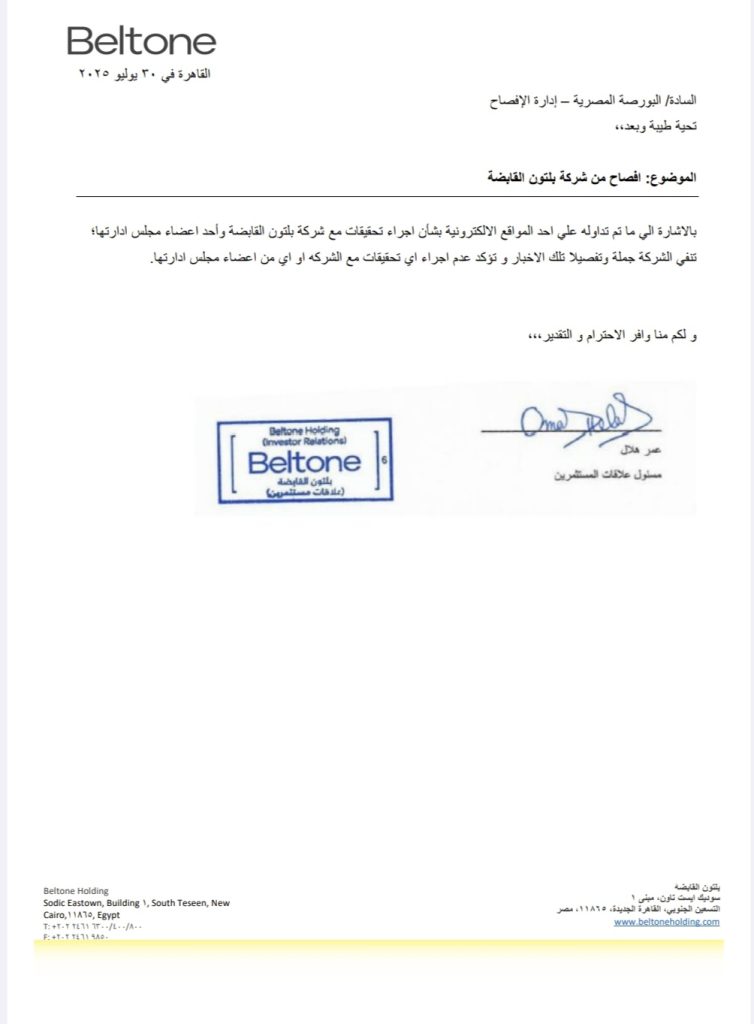 كشفت شركة بلتون القابضة، في إفصاح للبورصة المصرية، حقيقة ما يتداول حول إجراء تحقيقات مع الشركة وأحد أعضاء مجلس إدارتها.