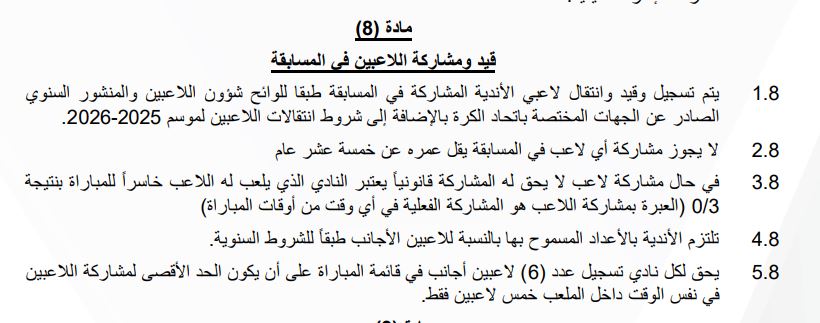 ووفقًا للمادة 8 في لائحة دوري الموسم الجديد يتم تسجيل وقيد اللاعبين مع أنديتهم طبقا للوائح شؤون اللاعبين والمنشور السنوي الخاص بها والذي يصدره اتحاد الكرة، وتضمنت المادة تأكيدًا على عدم أحقية أي نادٍ في إشراك أي لاعب يقل عمره عن 15 عامًا.