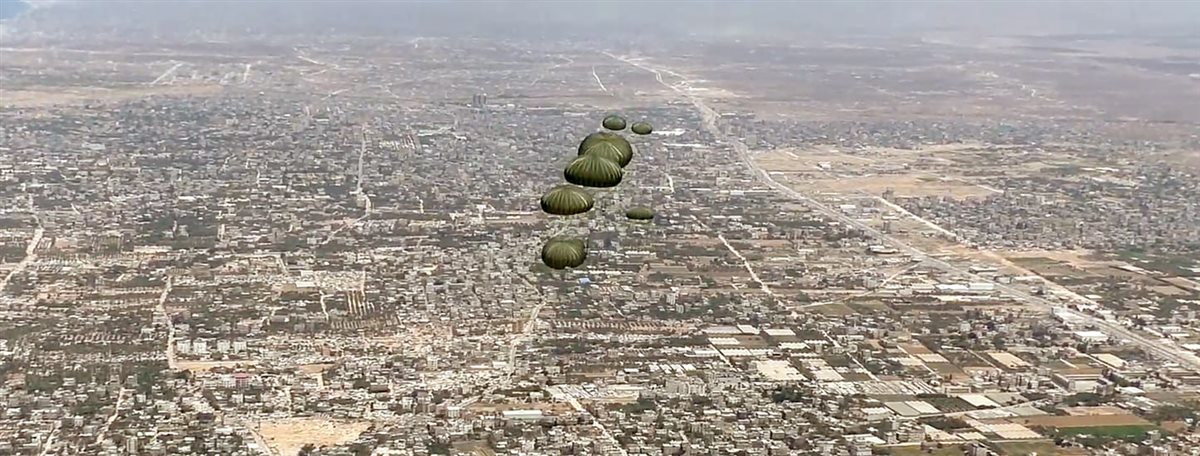 ويوم الأربعاء الماضي، أعلن المتحدث العسكري، إسقاط جوي للمساعدات بعدما أقلعت 4 طائرات نقل عسكرية من جمهورية مصر العربية محملة بأطنان من المساعدات الغذائية لتنفيذ أعمال الإسقاط الجوي على المناطق التي يصعب الوصول إليها برا بقطاع غزة، وذلك لتخفيف حدة الأوضاع المعيشية الصعبة ونقص الاحتياجات الإنسانية التي يعانى منها سكان القطاع، بالتزامن مع استمرار تقديم المساعدات برا.