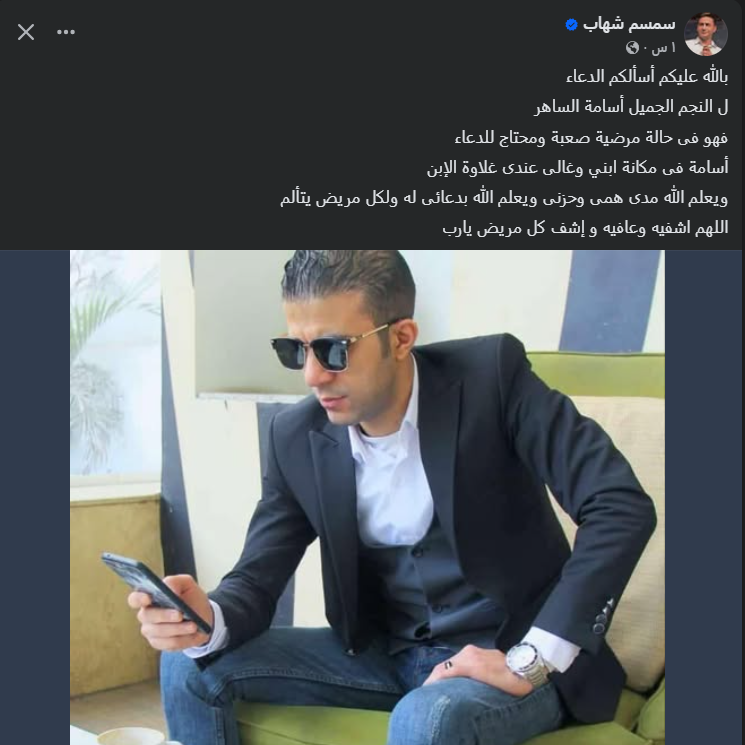 وشارك سمسم شهاب متابعيه صورة للفنان أسامة الساهر، عبر حسابه الشخصي بموقع فيس بوك، وعلق عليها قائلًا: بالله عليكم أسألكم الدعاء لنجم أسامة الساهر فهو في حالة مرضية صعبة ومحتاجة الدعاء.