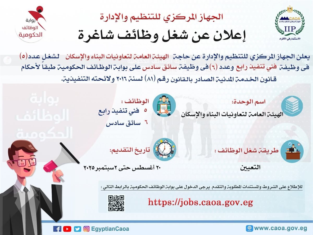 التنظيم والإدارة يُعلن عن مسابقة لشغل عدد 11 وظيفة فني وسائق بالهيئة العامة لتعاونيات البناء والإسكان