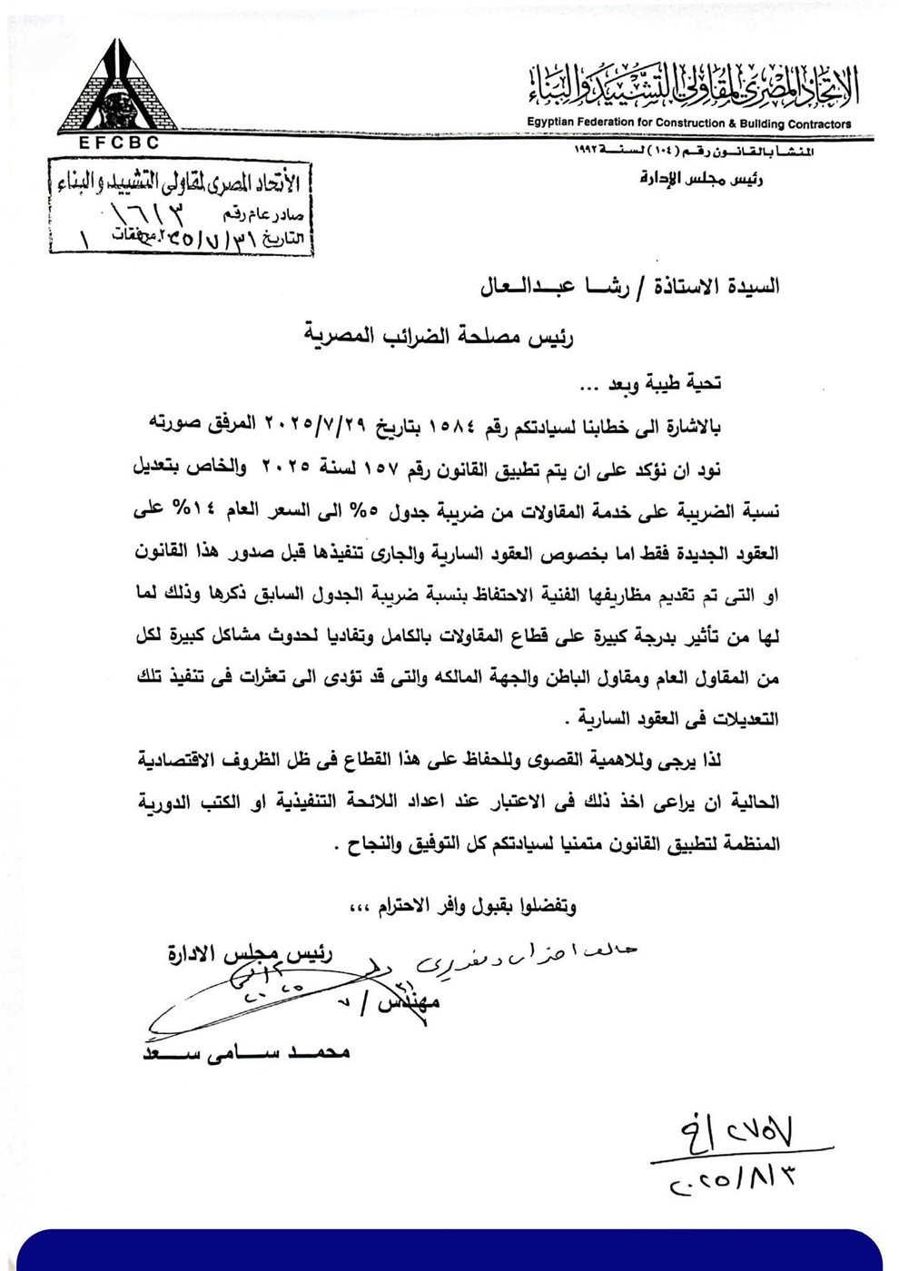 تقدم المهندس محمد سامي سعد، رئيس مجلس إدارة الاتحاد المصري لمقاولي التشييد والبناء، بمذكرة رسمية لـ رشا عبدالعال، رئيس مصلحة الضرائب المصرية، لمناقشة آلية تطبيق القانون رقم 157 لسنة 2023، والذي يقضي بتعديل سعر ضريبة القيمة المضافة على خدمات المقاولات من نسبة ضريبة الجدول 5% إلى السعر العام 14%.