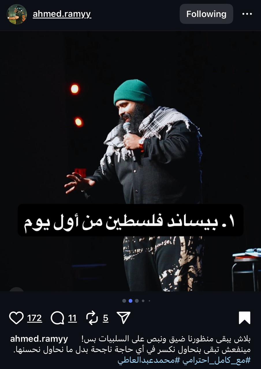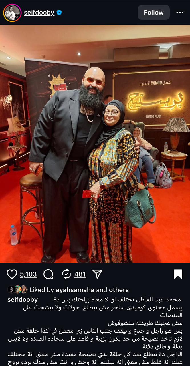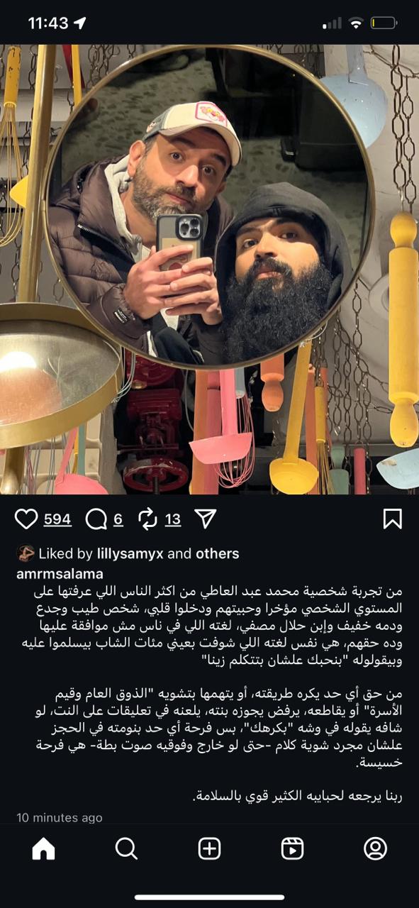 وكتب المخرج عمرو سلامة منشورًا متضامنًا: من تجربة شخصية محمد عبد العاطي من أكثر الناس اللي عرفتها على المستوي الشخصي مؤخرا وحبيتهم ودخلوا قلبي شخص طيب وجدع ودمه خفيف وابن حلال مصفي لغته اللي في ناس مش موافقة عليها وده حقهم، هي نفس لغته اللي شوفت بعيني مئات الشاب بيسلموا عليه وبيقولوله.. بنحبك علشان بتتكلم زينا.. من حق أي حد يكره طريقته، أو يتهمها بتشويه الذوق العام وقيم الأسرة أو يقاطعه، ويرفض يجوزه بنته يلعنه في تعليقات على النت لو شافه يقوله في وشه بكرهك، بس فرحة أي حد بنومته في الحجز علشان مجرد شوية كلام حتى لو خارج وفوقيه صوت بطة هي فرحة خسيسة.. ربنا يرجعه لحبايبه الكثير قوي بالسلامة.