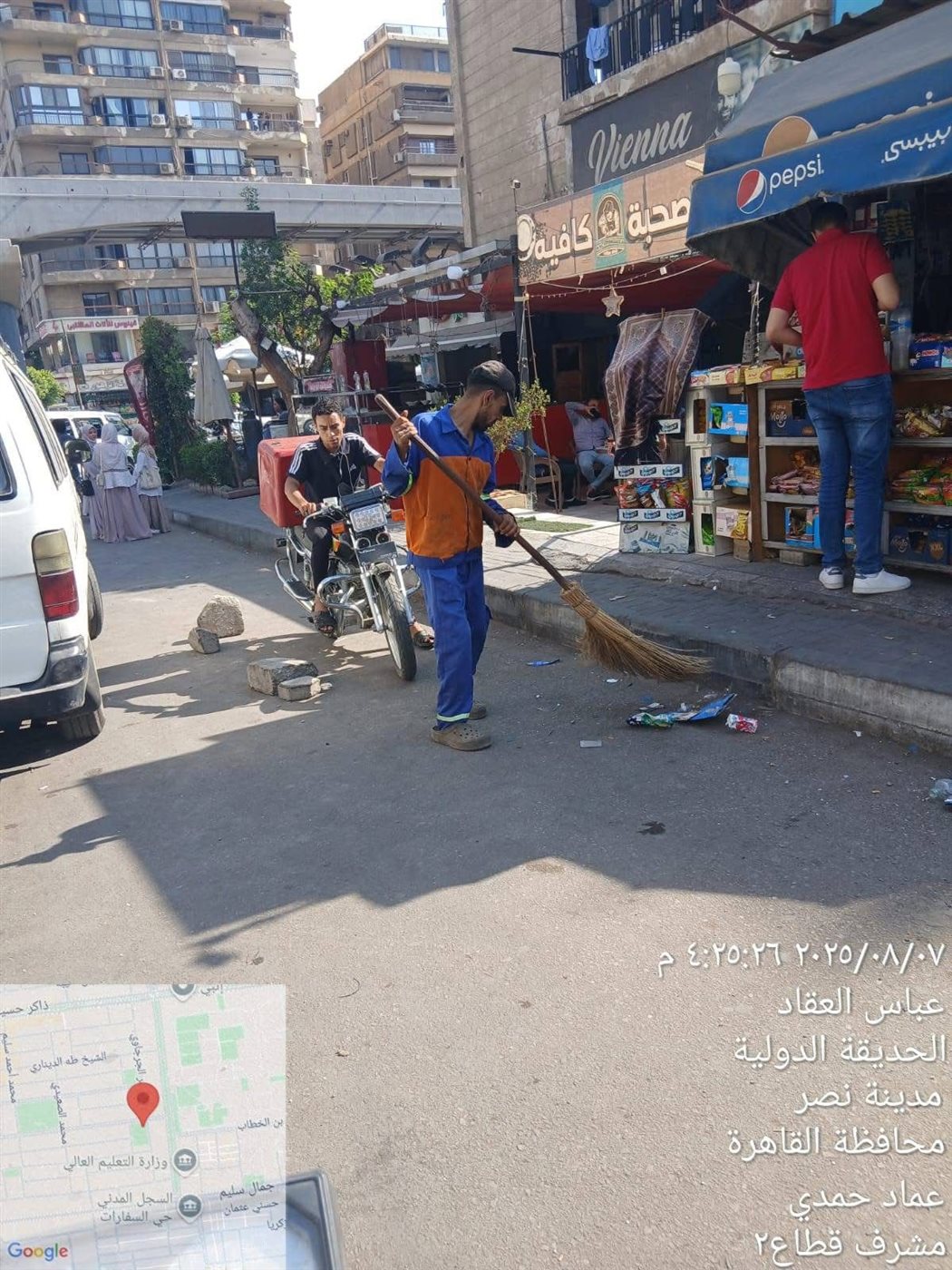 فيما واصل حي شرق مدينة نصر جهوده خلال الوردية المسائية، حيث نُفذت حملات مكثفة بالتنسيق بين إدارة الرصد البيئي وشركة “إنفيروماستر”.