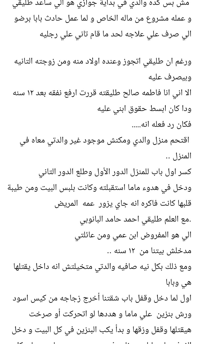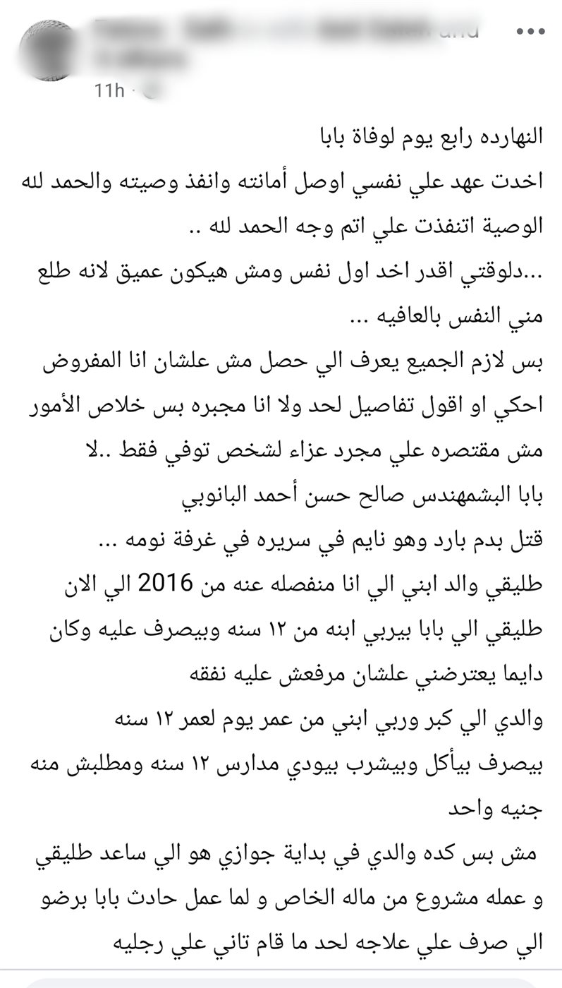 وقالت فاطمة في منشورها، إن الواقعة حدثت في إحدى مناطق محافظة البحيرة، قائلة: لازم الجميع يعرف اللي حصل.. بابا البشمهندس صالح حسن أحمد البانوبي، قتل بدم بارد وهو نايم في سريره في غرفة نومه، من طليقي والد ابني اللي أنا منفصله عنه من 2016 حتى الآن.