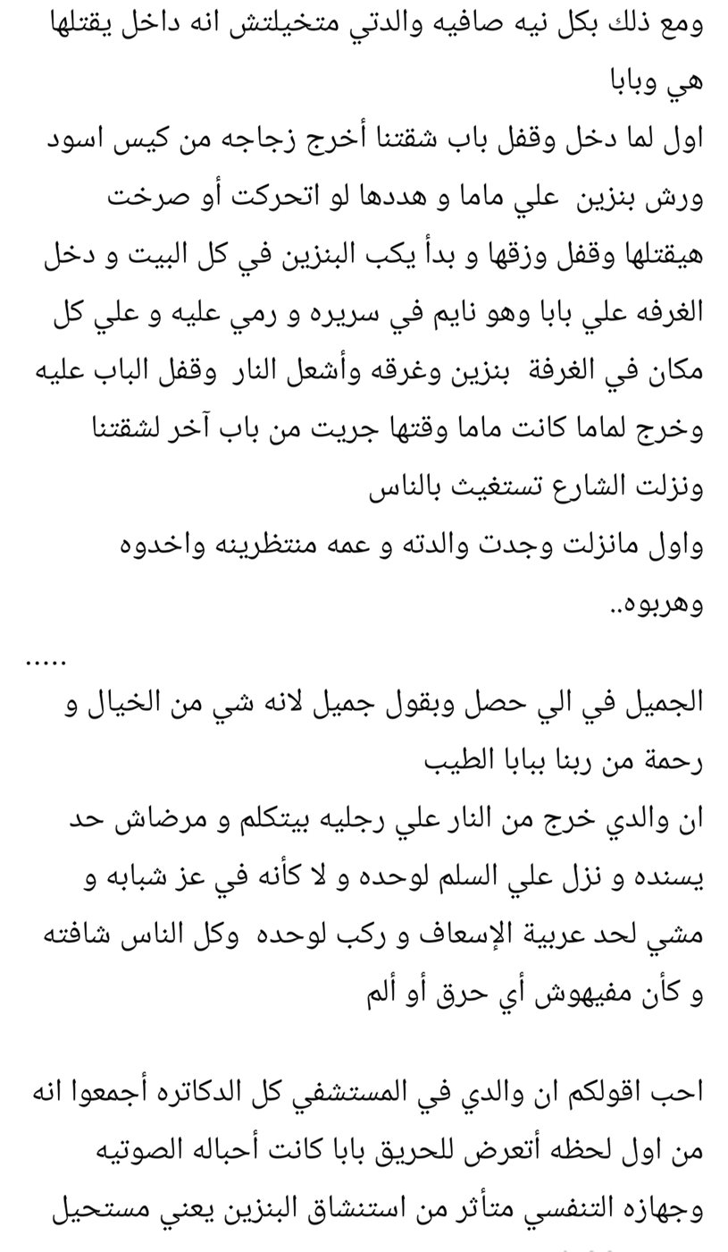 وأول مانزلت وجدت والدته وعمه منتظرينه واخدوه وهربوه، ووالدي تمكن من خرج من النار على رجليه بيتكلم، ومشي لحد عربية الإسعاف، وفي المستشفى كل الدكاتره أجمعوا إنه من اول لحظه أتعرض للحريق.. بابا كانت أحباله الصوتية وجهازه التنفسي متأثر من استنشاق البنزين يعني مستحيل يتكلم و80% من جسمه حروق من الدرجة التالتة، إلا إنه طول الوقت كان بيقول الحمد لله ولا إله إلا الله.. ومات متأثرا بالإصابة واحتسبناه عند الله.