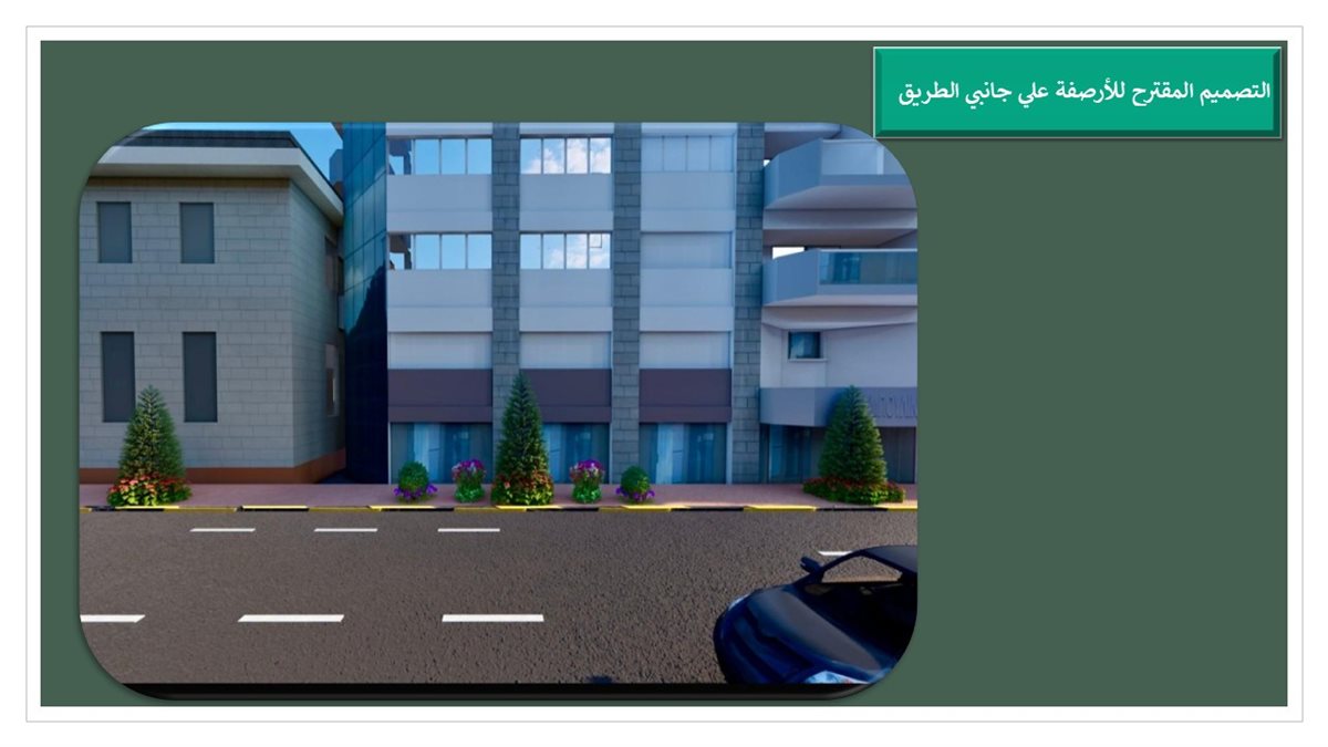 أما بالنسبة للأرصفة علي جانبي الطريق تم اختبار أشجار لا تعيق حركة المشاة ومنتظمة النمو حتى لا تتعارض مع واجهات المباني والخدمات مثل شجرة السرو الإيطالي مع التدعيم بشجيرات مثل التويا والجهنمية وكذلك النباتات العطرية والزهور، وذلك في إطار خطة المحافظة للارتقاء بأعمال التشجير وفق الهوية البصرية للطرق.