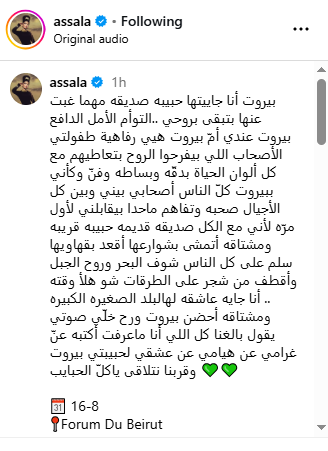 وتابعت أصالة: وكأني ببيروت كل الناس أصحابي بيني وبين كل الأجيال صحبة وتفاهم، ما حدا بيقابلني لأول مرة، لأني مع الكل صديقة قديمة حبيبة قريبة ومشتاقة أتمشى بشوارعها أقعد بقهاويها سلم على كل الناس شوف البحر، وروح الجبل، وأقطف من شجر على الطرقات شو هلأ وقته.
