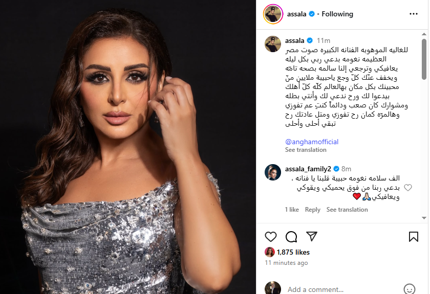 وكتبت أصالة منشورا، عبر حسابها الشخصي بـ إنستجرام، قالت فيه: الغالية الموهوبة الفنانة الكبيرة، صوت مصر العظيمة نغومة، بدعي ربي بكل ليلة يعافيكي وترجعي إلنا سالمة بصحة تامّة ويخفف عنّك كلّ وجع يا حبيبة ملايين منّ محبينك بكل مكان بها العالم، كلّه كلّ أهلك بيدعوا لك ورح ندعي لك أنتِ بطلة ومشوارك كان صعب ودائمًا كنتِ بتفوزي وهالمرّة كمان رح تفوزي مثل عادتك رح تبقي أحلى وأحلى.