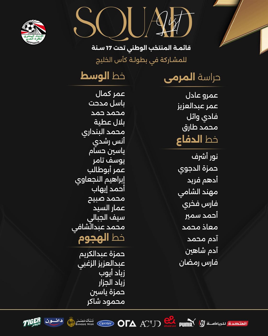 اختار الجهاز الفني للمنتخب الوطني تحت 17 عامًا بقيادة أحمد الكاس، القائمة الأولية التي وقع عليها الاختيار للمشاركة في بطولة كأس الخليج تحت 20 عامًا، التي تقام في مدينة أبها السعودية في الفترة من 28 أغسطس وحتى 9 سبتمبر.