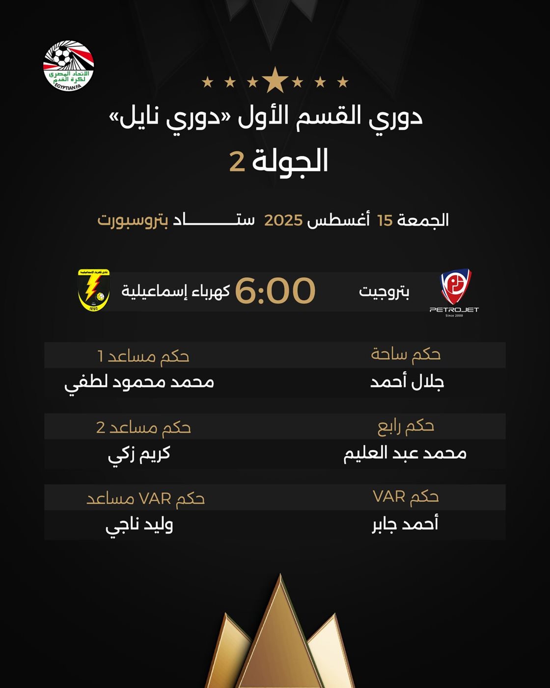 ويدير لقاء بتروجت وكهرباء الإسماعيلية على ستاد بتروسبورت الحكم جلال أحمد، ويعاونه محمد محمود لطفي وكريم زكي، ومحمد عبد المنعم حكمًا رابعًا، فيما يدير غرفة الفيديو أحمد جابر ويعاونه وليد ناجي.