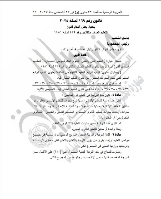 وفي وقت سابق، علم القاهرة 24 من مصادر مطلعة بوزارة التربية والتعليم والتعليم الفني، أن الوزارة بصدد تنفيذ نقلة نوعية كبرى في مسار التعليم الفني بمصر، من خلال إطلاق شهادة جديدة تحت مسمى البكالوريا التكنولوجية المصرية، التي ستُعتمد رسميًا بديلًا عن الدبلومات الفنية التقليدية، وذلك في إطار تعديلات جديدة تم إدراجها في قانون التعليم.