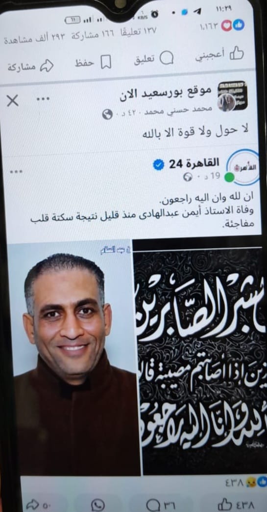 نشر حساب شخصي باسم محمد حسني جاد منشورًا خبرًا يحوي خبرًا كاذبًا يدّعي فيه وفاة أيمن عبد الهادي مدير مكتب بورسعيد بموقع القاهرة 24.