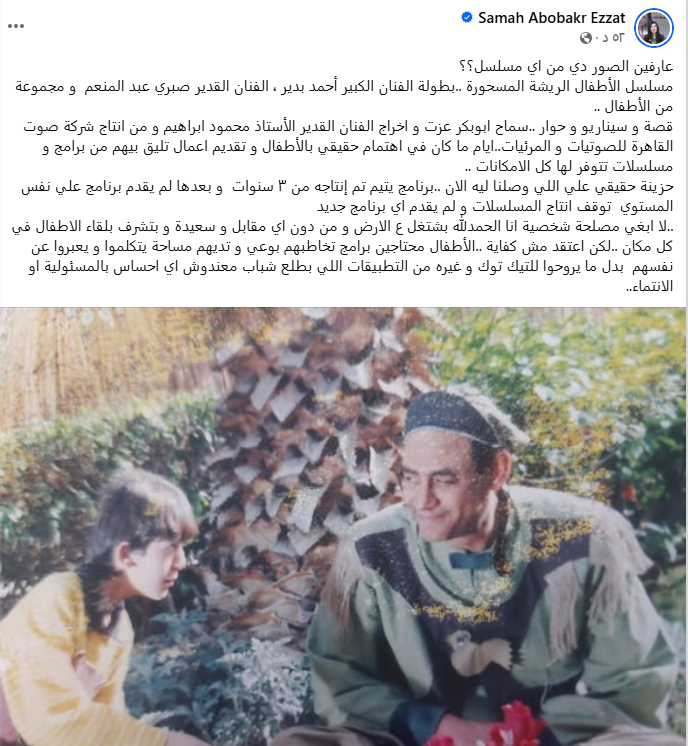 وأضافت سماح أبو بكر عزت: حزينة حقيقي على اللي وصلنا ليه الآن، برنامج يتيم تم إنتاجه من 3 سنوات، وبعدها لم يقدم برنامج على نفس المستوى، توقف إنتاج المسلسلات ولم يقدم أي برنامج جديد، أنا لا أبغى مصلحة شخصية، أنا الحمد لله بشتغل على الأرض، ومن دون أي مقابل وسعيدة وبتشرف بلقاء الأطفال في كل مكان، لكن اعتقد مش كفاية، الأطفال محتاجين برامج تخاطبهم بوعي وتديهم مساحة يتكلموا ويعبروا عن نفسهم، بدل ما يروحوا للتيك توك وغيره من التطبيقات اللي بطلع شباب معندوش أي إحساس بالمسؤولية أو الانتماء.