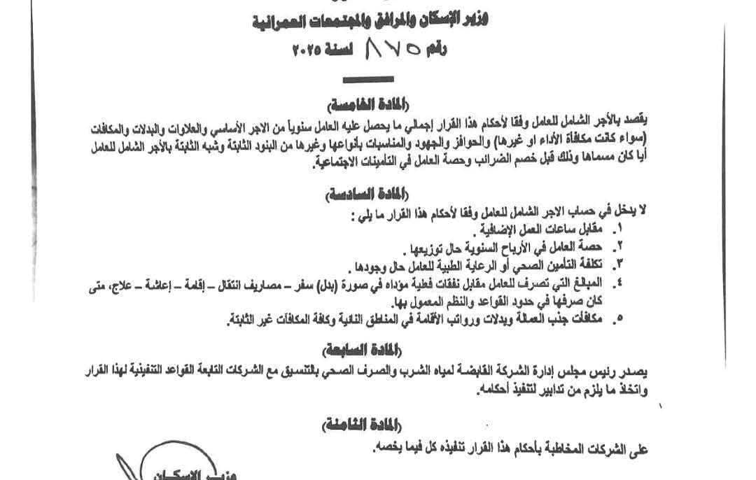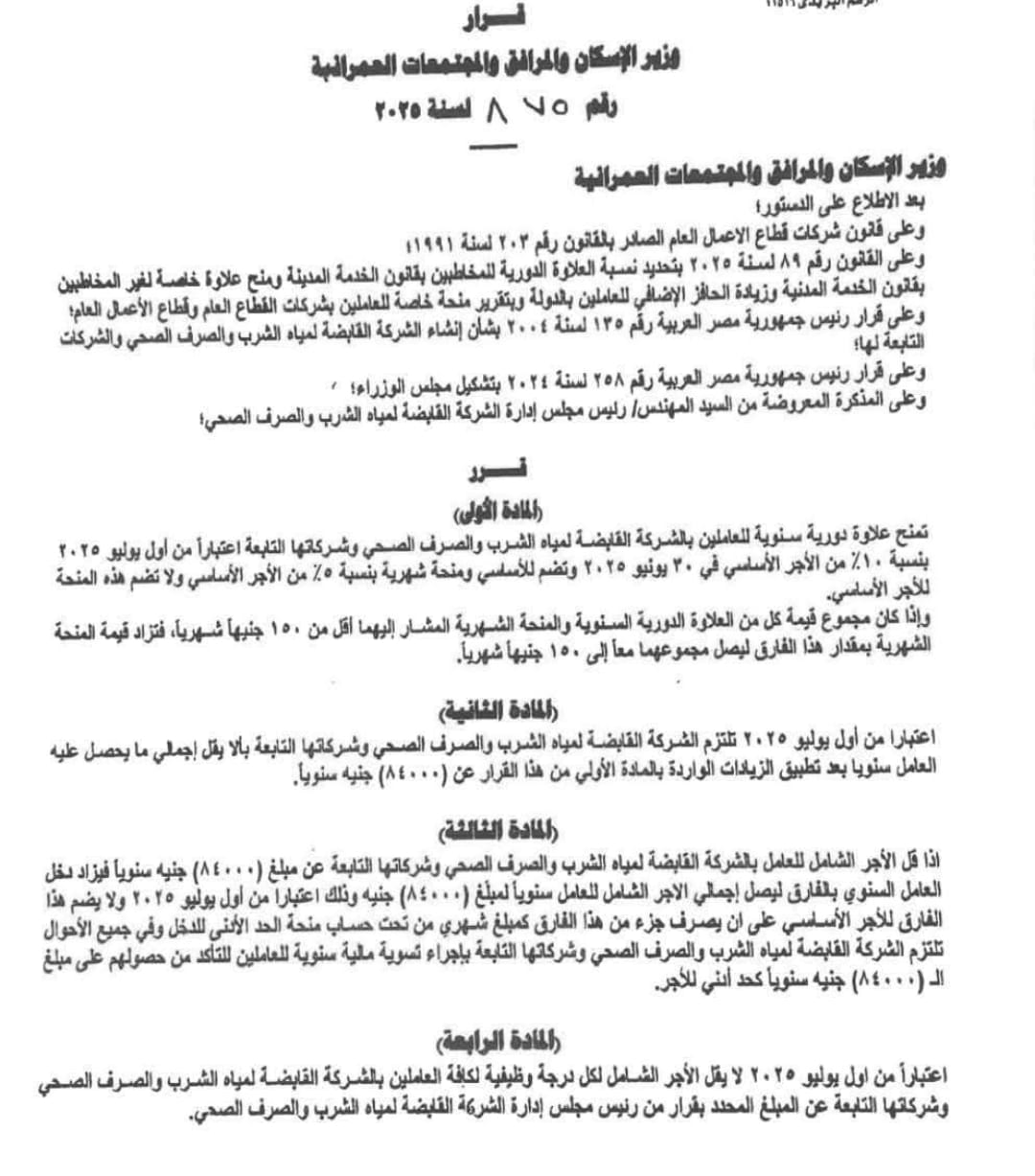 - اعتبارًا من أول يوليو 2025 تلتزم الشركة القابضة لمياه الشرب والصرف الصحي وشركاتها التابعة بألا يقل إجمالي ما يحصل عليه العامل سنويا بعد تطبيق الزيادات الواردة بالمادة الأولى من هذا القرار عن 84000 جنيه سنويًا.