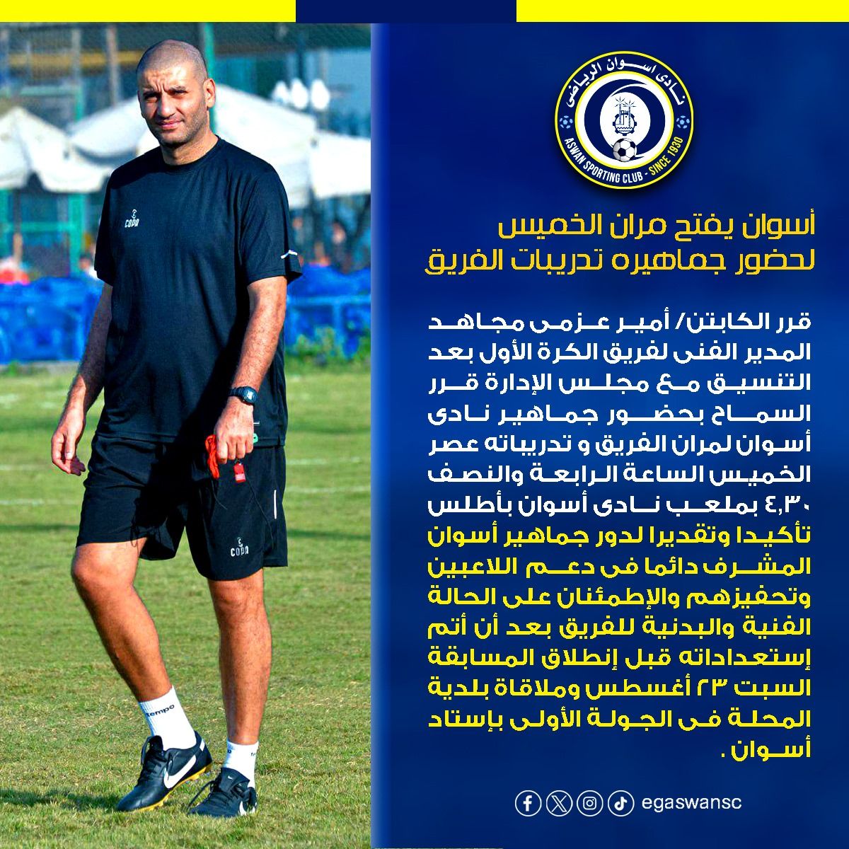 ومن المقرر أن يُقام التدريب المفتوح في تمام الساعة الرابعة والنصف (4:30 مساءً) على ملعب نادي أسوان بمنطقة أطلس، وذلك قبل يومين فقط من انطلاق الموسم الجديد.