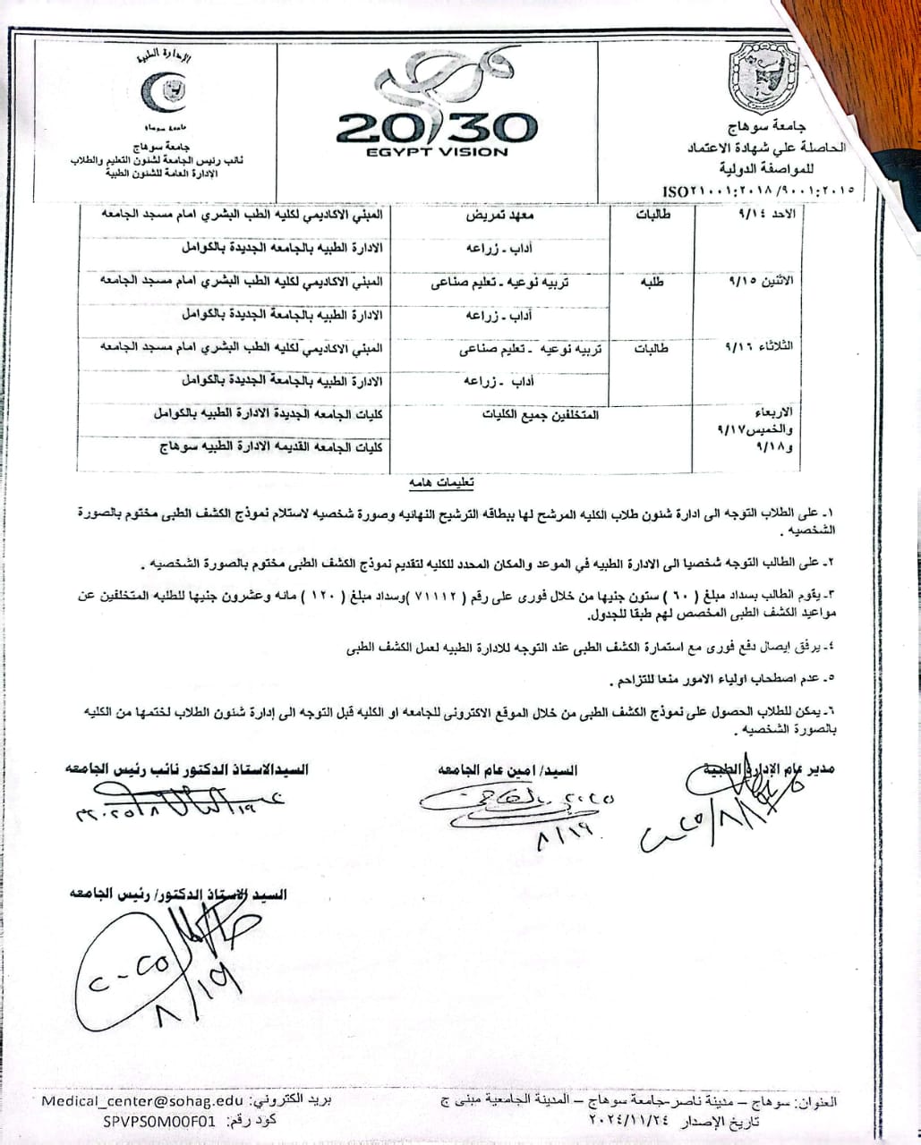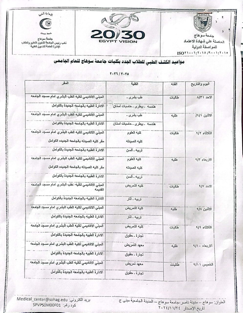 جامعة سوهاج تعلن مواعيد الكشف الطبي للطلاب الجدد بمختلف الكليات