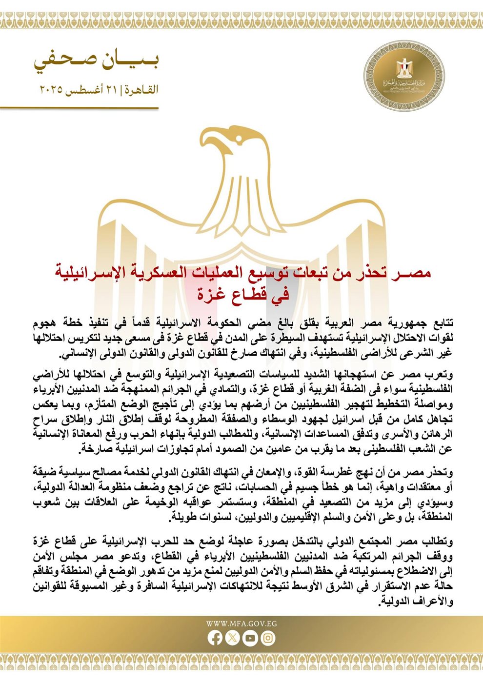 أفادت الخارجية، بأن جمهورية مصر العربية تتابع بقلق بالغ مضي الحكومة الإسرائيلية قدمًا في تنفيذ خطة هجوم لقوات الاحتلال الإسرائيلية تستهدف السيطرة على المدن في قطاع غزة في مسعى جديد لتكريس احتلالها غير الشرعي للأراضي الفلسطينية، وفي انتهاك صارخ للقانون الدولي والقانون الدولي الإنساني.
