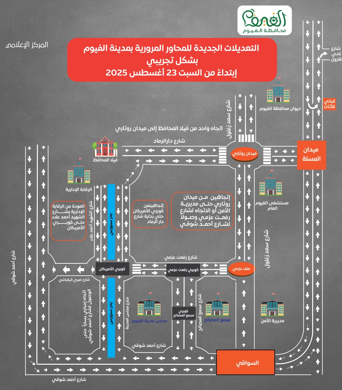 أعلن الدكتور أحمد الأنصاري محافظ الفيوم بدء العمل بتعديلات المحاور المرورية الجديدة بمدينة الفيوم، بشكل تجريبي، بعد غدٍ السبت 23 أغسطس، وذلك في إطار حرص المحافظة على تحقيق إنسيابية الحركة، وتقليل الاختناقات المرورية، وتسهيل سبل التنقل الآمن داخل مدينة الفيوم، للتيسير على المواطنين.