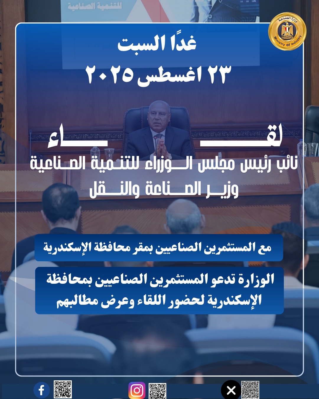 تعلن وزارة الصناعة أنه تقرر يوم السبت الموافق 23 أغسطس استقبال المستثمرين الصناعيين بمحافظة الإسكندرية بحضور الفريق أحمد خالد، محافظ الإسكندرية وذلك بمقر المحافظة في تمام الساعة 10 صباحًا.