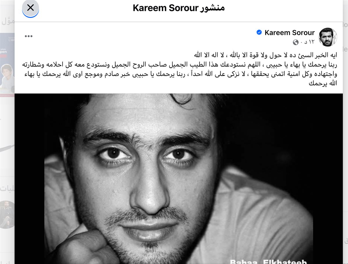 توفي منذ قليل الفنان الشاب بهاء الخطيب، في خبر أعلن عنه صديقه الفنان كريم سرور عبر حسابه الشخصي على موقع فيس بوك، حيث نعاه بكلمات مؤثرة قائلاً: إيه الخبر السيئ ده؟ لا حول ولا قوة إلا بالله، لا إله إلا الله.. ربنا يرحمك يا بهاء يا حبيبي، اللهم نستودعك هذا الطيب الجميل، صاحب الروح الجميلة.