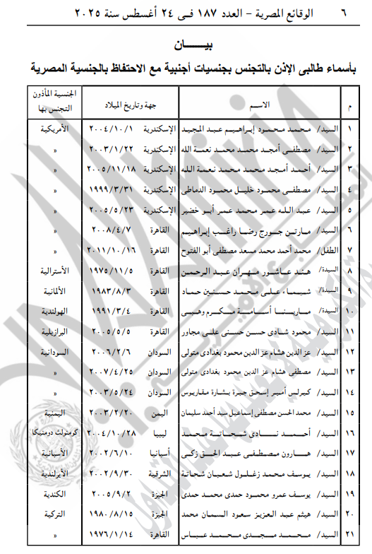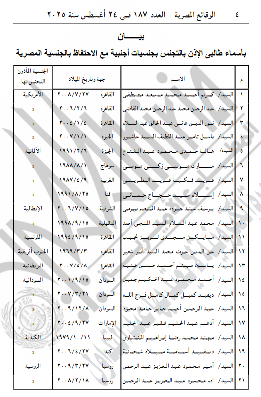 وفي القرار رقم 1299 لسنة 2025 نصت المادة الأولى على أن يؤذن لكل من الـ 21 مواطنا أولهم محمد محمود إبراهيم عبد المجيد، وآخرهم محمد مجدي محمد عباس، المدرجة أسماؤهم بالبيان المرفق بالتجنس بالجنسية الأجنبية الموضحة قرين اسم كل منهم، مع احتفاظهم بالجنسية المصرية.