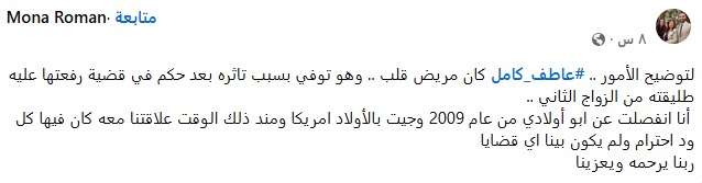 وكتبت طليقة عاطف كامل الأولى عبر فيس بوك: لتوضيح الأمور.. عاطف كامل كان مريض قلب، وهو توفى بسبب تأثره بعد حكم في قضية رفعتها عليه طليقته من الزواج الثاني، أنا انفصلت عن أبو أولادي من عام 2009، وجيت بالأولاد أمريكا ومنذ ذلك الوقت علاقتنا معه كان فيها كل ود احترام ولم يكن بيننا أي قضايا ربنا يرحمه ويعزينا.