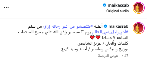 وكتبت مي كساب في منشور عبر حسابها الرسمي بـ إنستجرام: أغنية هتعيشوا من غير رجالة إزاي من فيلم آخر راجل في العالم يوم 3 سبتمبر بإذن الله على جميع المنصات الساعة 7 مساءً، من كلمات وألحان عزيز الشافعي، توزيع وميكس وماستر أحمد وحيد كينج.