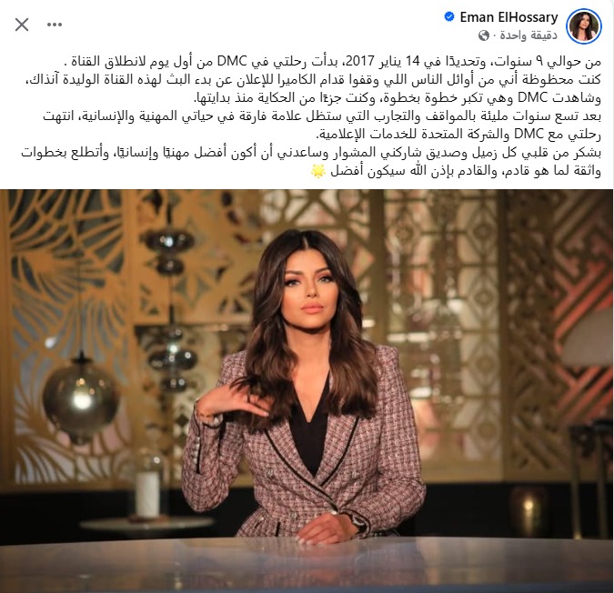 وكتبت إيمان الحضري منشورًا، عبر حسابها الشخصي بموقع التواصل الاجتماعي فيس بوك، قالت فيه: من حوالي 9 سنوات، وتحديدًا في 14 يناير 2017، بدأت رحلتي في DMC من أول يوم لانطلاق القناة، كنت محظوظة إني من أوائل الناس اللي وقفوا قدام الكاميرا للإعلان عن بدء البث لهذه القناة الوليدة آنذاك، وشاهدت DMC وهي تكبر خطوة بخطوة، وكنت جزءًا من الحكاية منذ بدايتها.