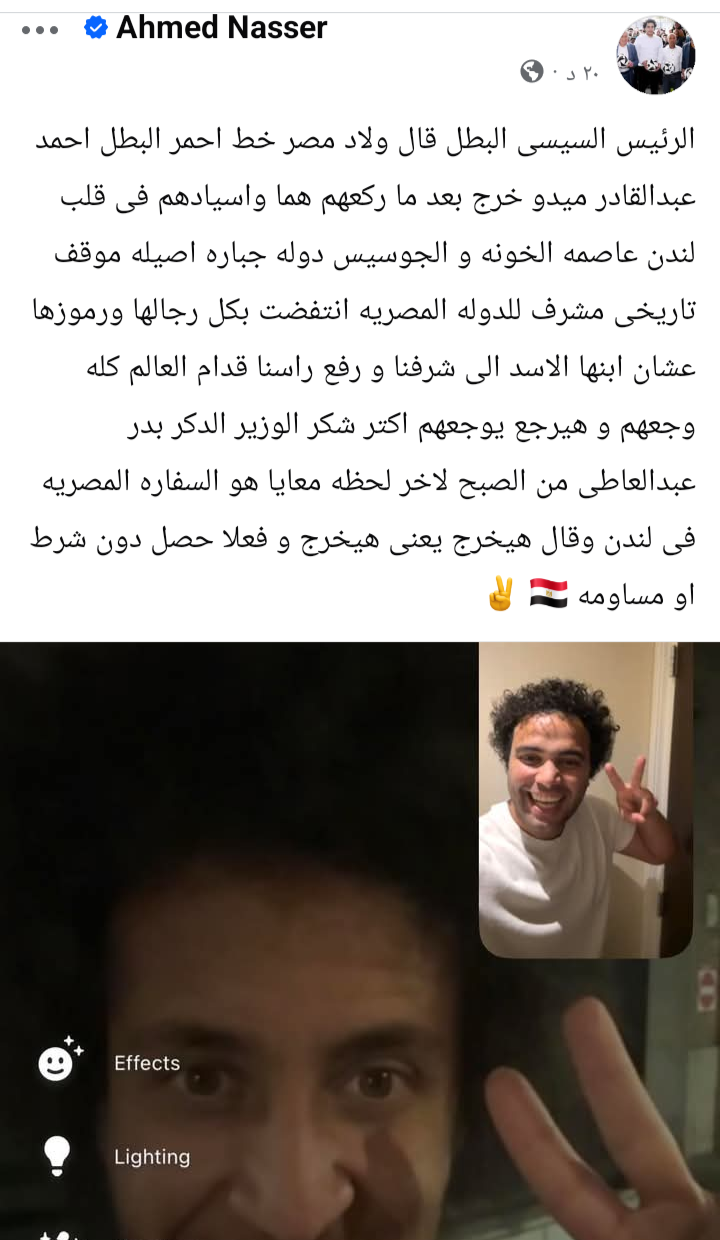 واضاف ناصر في تصريح له: الرئيس السيسي البطل قالها صراحة إن ولاد مصر خط أحمر، والبطل أحمد عبدالقادر (ميدو) خرج بعد ما اربك خصوم الدولة وأفشل مخططاتهم في قلب لندن، عاصمة من اعتادت احتضان الأصوات المعادية.