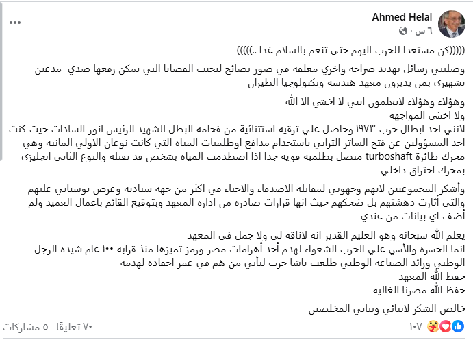 نشر الدكتور أحمد هلال، أستاذ هندسة الطيران، على صفحته الرسمية فيسبوك، تفاصيل ما وصفه بوقائع فصل لعدد من العاملين بـ معهد هندسة وتكنولوجيا الطيران، إلى جانب ما اعتبره إهدارًا للمال من خلال بدلات لمجلس إدارة المعهد.