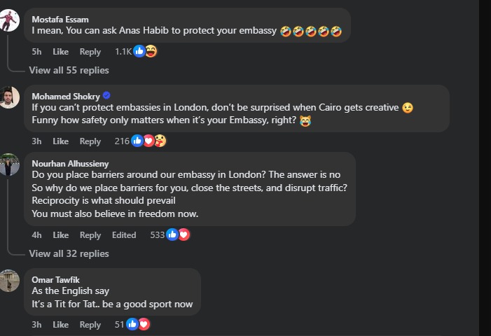 انتو اللي بدأتوا ماتخافوش دي مجرد حواجز.. كيف جاءت ردود المصريين على بوست إغلاق السفارة البريطانية؟