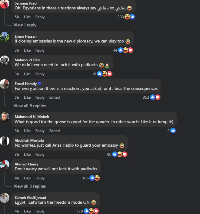 وجاءت تعليقات المصريين مثيرة للجدل، فبعضها كان عبارة عن كوميكس وتهكم من القرار البريطاني مثل: ماتخافوش دي مجرد حواجز بس، أنتم من بدأ، مصر الآن فعلت زر الحرية الذي تنادون به دائمًا، لا تقلقوا فلن نغلقها بالأقفال.