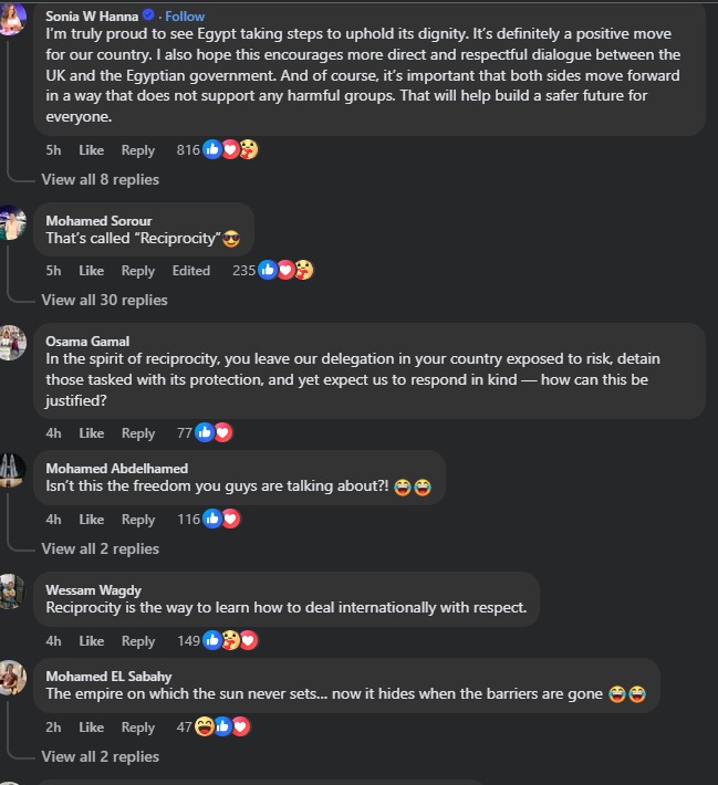 وبعضها جاء بشكل جدي للغاية، مشيرين إلى أن السلطات البريطانية لم تحمي السفارة المصرية في لندن فلماذا تحمي مصر السفارة البريطانية في القاهرة؟ لكل فعل رد فعل وعليكم احترام هذا المبدأ.
