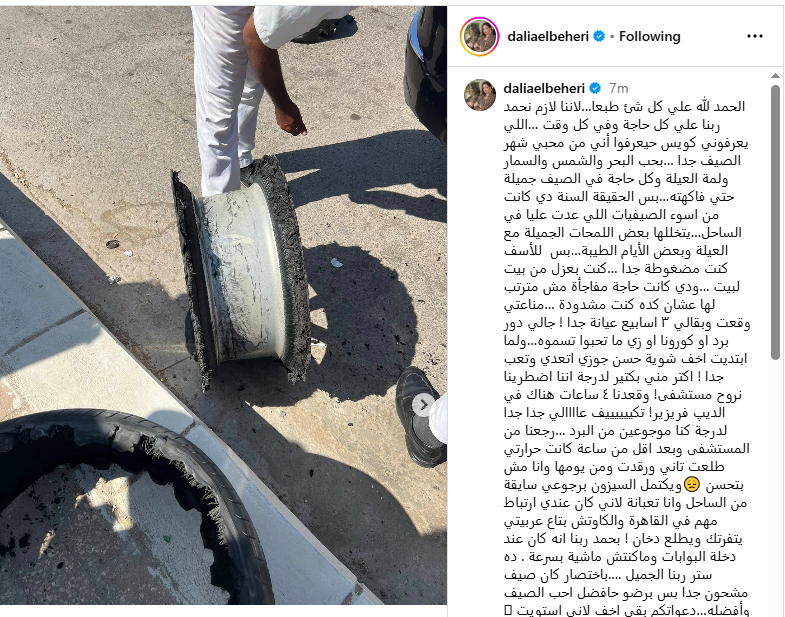 ونشرت داليا صورة لها من الحادث، عر حسابها الشخصي بـ إنستجرام، وعلقت عليها: الحمد لله على كل شيء طبعا، لأننا لازم نحمد ربنا على كل حاجة وفي كل وقت، اللي يعرفوني كويس هيعرفوا أني من محبي شهر الصيف جدا، بحب البحر والشمس والسمار ولمة العيلة وكل حاجة في الصيف جميلة حتي فاكهت، بس الحقيقة السنة دي كانت من اسوء الصيفيات اللي عدت عليا في الساحل، يتخللها بعض اللمحات الجميلة مع العيلة وبعض الأيام الطيبة، للأسف كنت مضغوطة جدا، كنت بعزل من بيت لبيت، ودي كانت حاجة مفاجأة مش مترتب لها عشان كده كنت مشدودة.