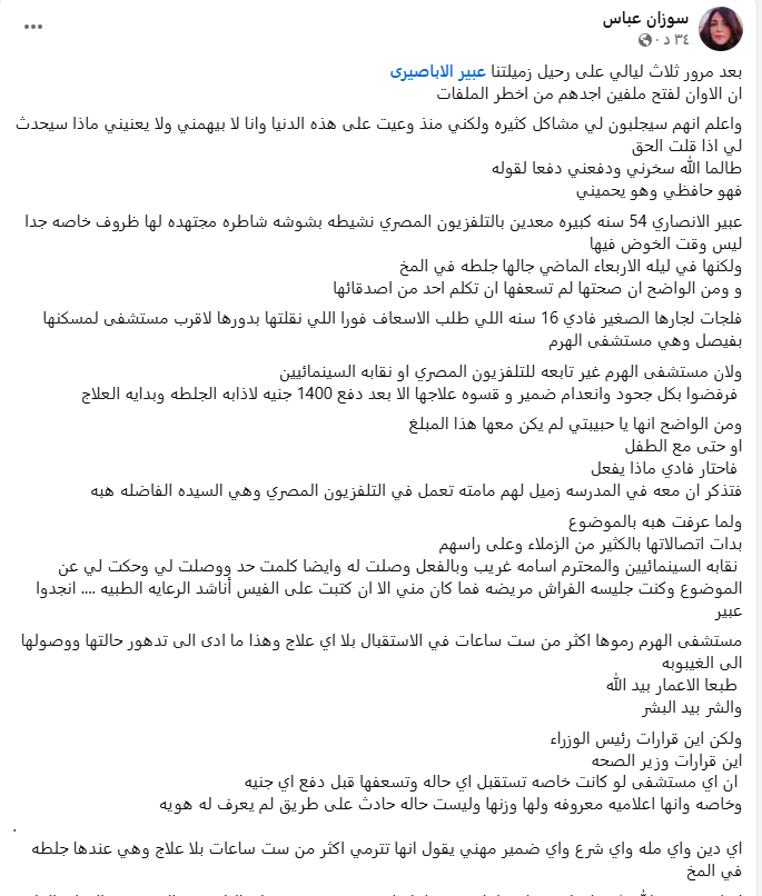 وكتب صديقة عبير الأباصيري منشورا، عبر حسابها الشخصي تروي فيه تفاصيل ما تعرضت له الراحلة، قبل وفاتها، حيث قالت: بعد مرور 3 ليالي على رحيل زميلتنا عبير الأباصيري، آن الآوان لفتح ملفين أجدهم من أخطر الملفات، وأعلم إنهم سيجلبون لي مشاكل كثيرة، ولكني منذ وعيت على هذه الدنيا وأنا لا بيهمني ولا يعنيني ماذا سيحدث لي اذا قلت الحق، عبير الأباصيري 54 سنة، كبيرة معدين بالتلفزيون المصري، مجتهدة، لها ظروف خاصه جدا ليس وقت الخوض فيها، ولكنها في ليلة الأربعاء الماضي جالها جلطة في المخ، ومن الواضح إن صحتها لم تسعفها أن تكلم أحد من أصدقائها، فلجأت لجارها الصغير فادي 16 سنة اللي طلب الإسعاف فورًا، اللي نقلتها بدورها لأقرب مستشفى لمسكنها بفيصل وهي مستشفى الهرم.