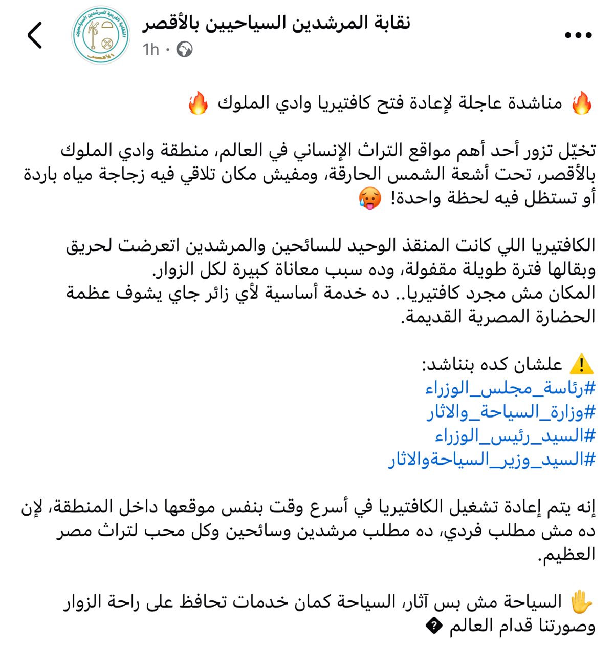 طالبت نقابة المرشدين السياحيين بمحافظة الأقصر، الجهات المعنية بسرعة التدخل لإعادة فتح كافتيريا منطقة وادي الملوك الأثرية، والتي أُغلقت عقب تعرضها لحريق، ما أثار استياء المرشدين والسائحين على حد سواء.