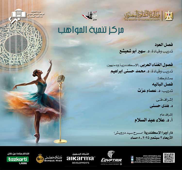 تقيم وزارة الثقافة ممثلة في دار الأوبرا المصرية برئاسة الدكتور علاء عبد السلام حفلًا للواعدين بمركز تنمية المواهب بأوبرا الأسكندرية ودمنهور تحت إشراف الدكتورة هدى حسنى وذلك فى الثامنة مساء الأربعاء 3 سبتمبر على مسرح سيد درويش "أوبرا الإسكندرية".