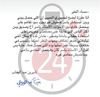وقالت شيرين عبد الوهاب في بيان: مساء الخير أنا عاوزة أوضح لجمهوري الحبيب إن اللي حصل بيني وبين المستشار ياسر قطنوش هو مجرد سوء تفاهم عابر بيحصل بين الإخوات، الأستاذ ياسر أخ وصديق، ومن أكتر الناس اللي خايفة على مصلحتي.