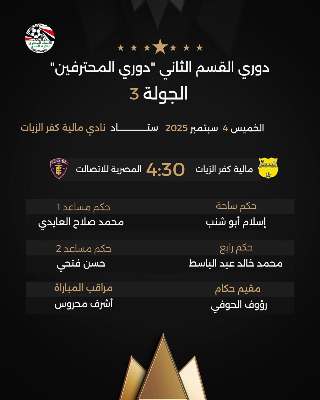 - مالية كفر الزيات يستضيف المصرية للاتصالات في استاد نادي مالية كفر الزيات. يقود المباراة الحكم إسلام أبو شنب، ويعاونه محمد صلاح العايدي وحسن فتحي.