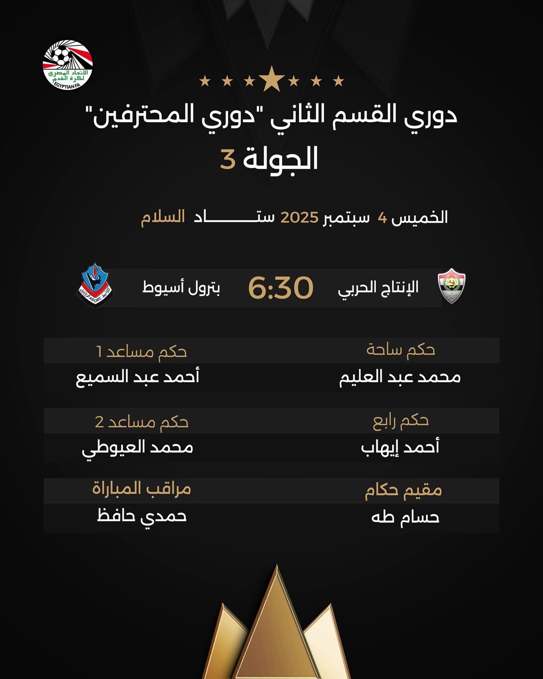 - الإنتاج الحربي يواجه بترول أسيوط في استاد السلام. يقود اللقاء الحكم محمد عبد العليم، ويعاونه أحمد عبد السميع ومحمد العيوبي.