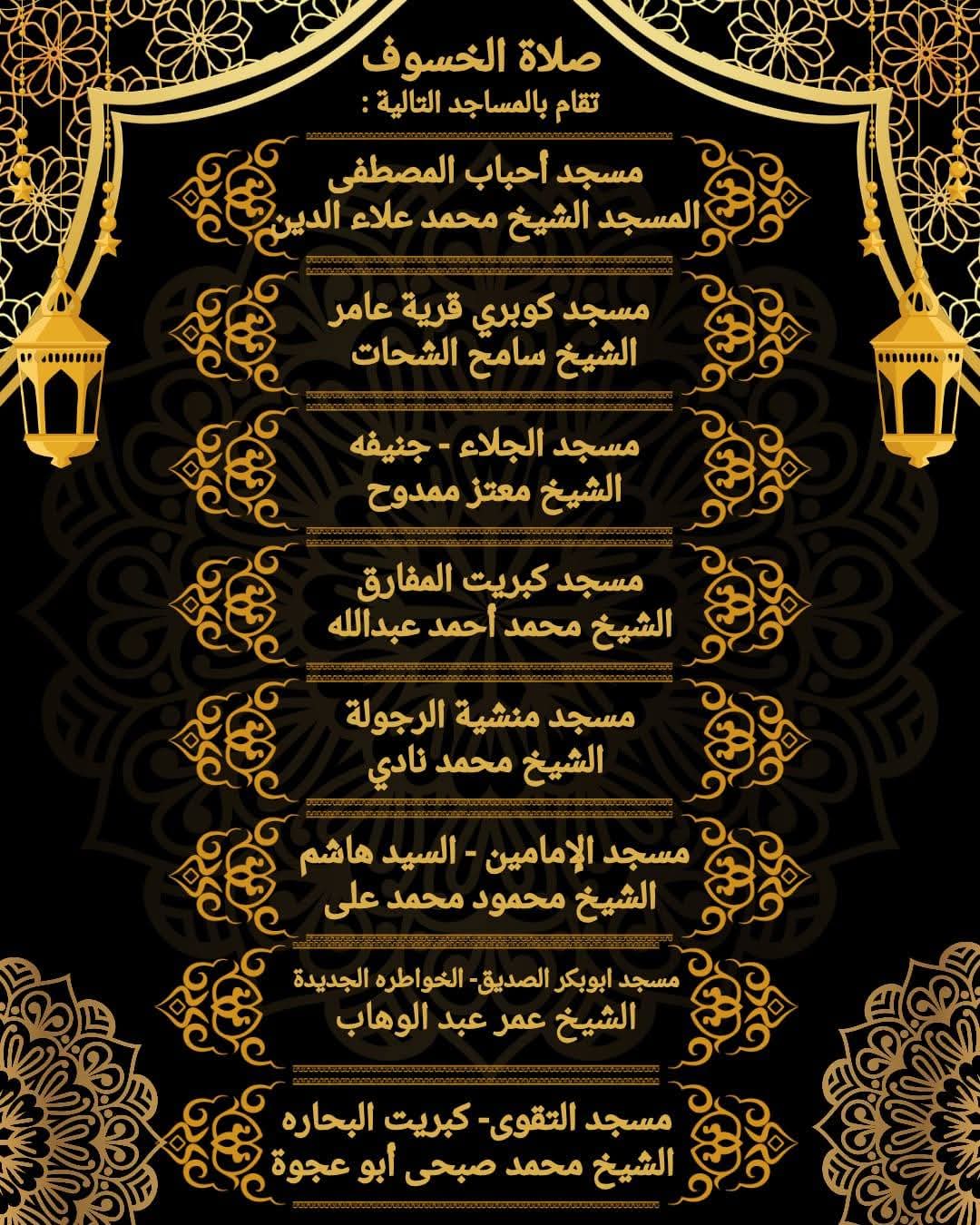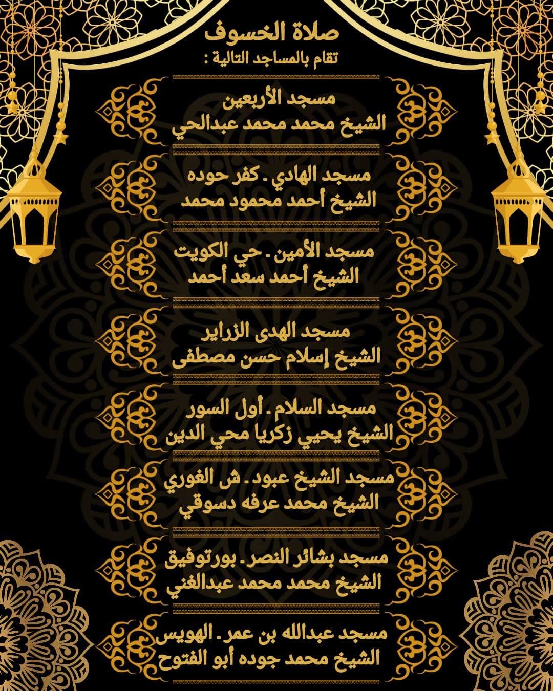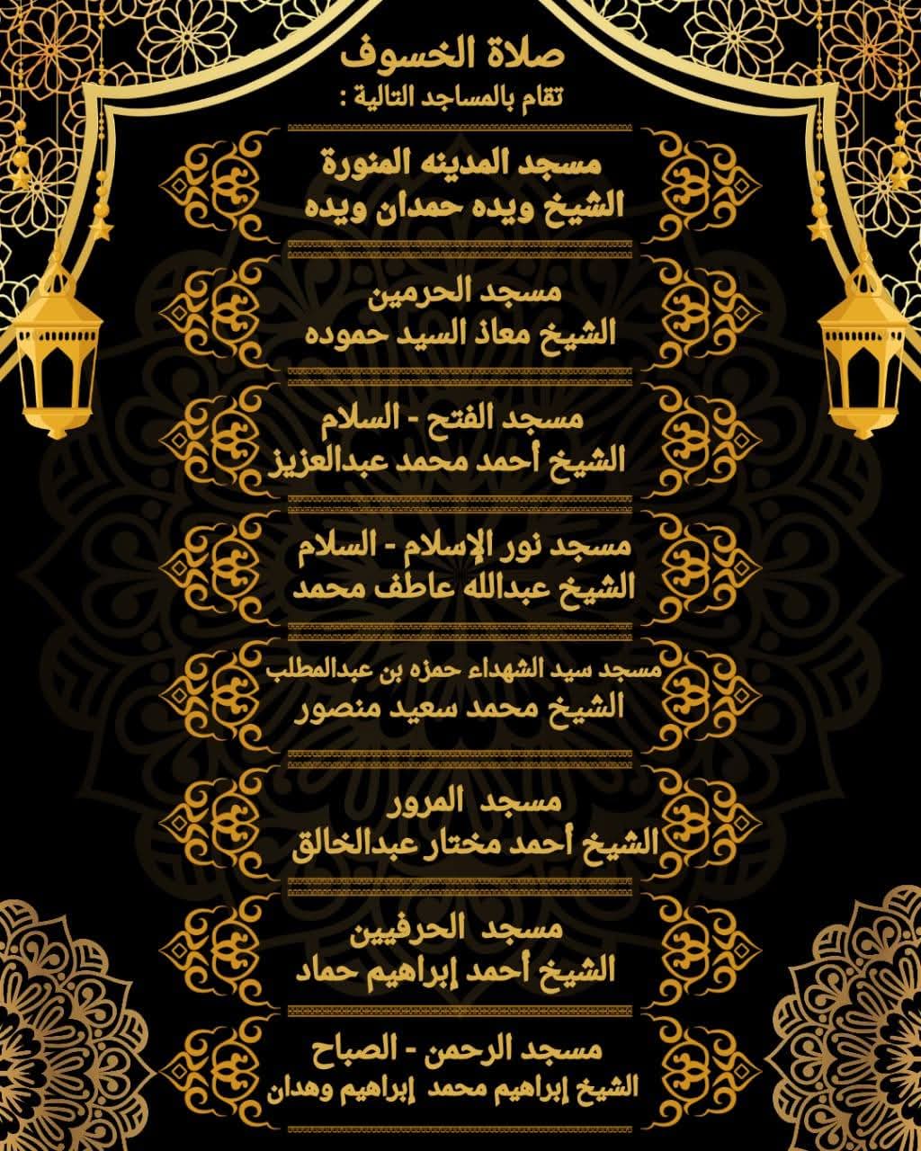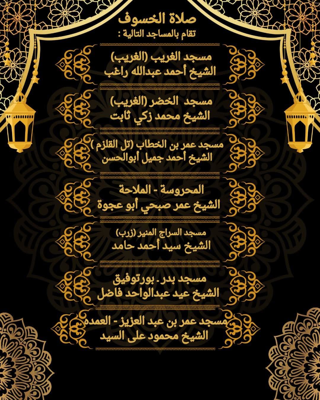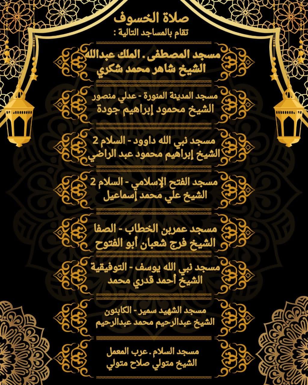 أوقاف السويس تعلن إقامة صلاة الخسوف عقب صلاة العشاء اليوم في 39 مسجدا