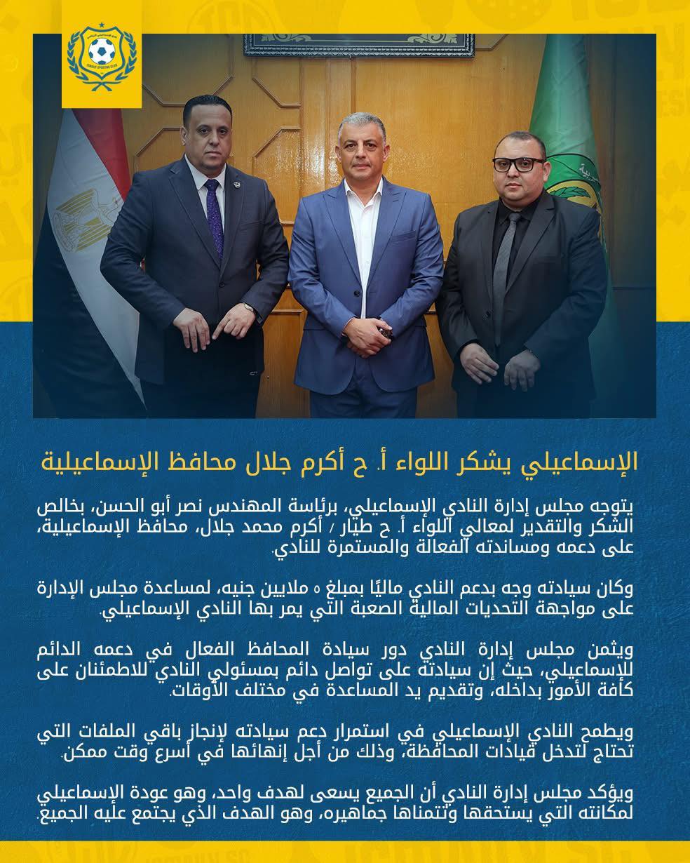 وقال النادي الإسماعيلي في بيان رسمي: يتوجه مجلس إدارة النادي الإسماعيلي، برئاسة المهندس نصر أبو الحسن، بخالص الشكر والتقدير لمعالي اللواء أ.ح طيار / أكرم محمد جلال، محافظ الإسماعيلية، على دعمه ومساندته الفعالة والمستمرة للنادي.